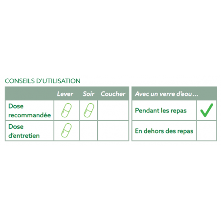 1 à 2 gélules / jour de préférence 10 minutes avant le repas avec un verre d’eau.