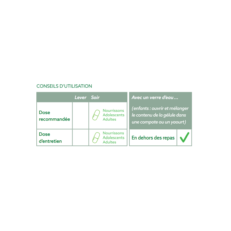Nourrissons et enfants : 1 gélule / jour.