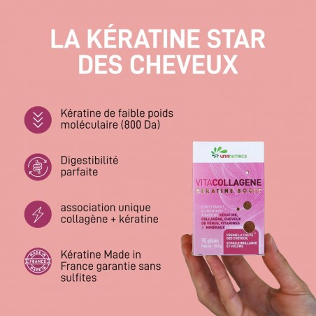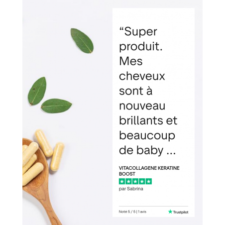 La kératine est une protéine présente dans les cheveux. Elle n'est pas assimilable en l'état, c'est pourquoi nous avons utilisé une kératine hydrolysée issue d'un procédé breveté qui permet d'obtenir une haute concentration en acides aminées (89%) et une digestibilité supérieure à 96%. La kératine utilisée dans notre formule bénéficie de nombreuses études in vitro ainsi que 2 études cliniques attestant de son effet bénéfique sur la pousse des cheveux. De plus, elle bénéficie de la composition la plus proche de la kératine contenue dans les cheveux humains. Enfin, cette kératine est fabriquée en France et est issue de l'économie circulaire.