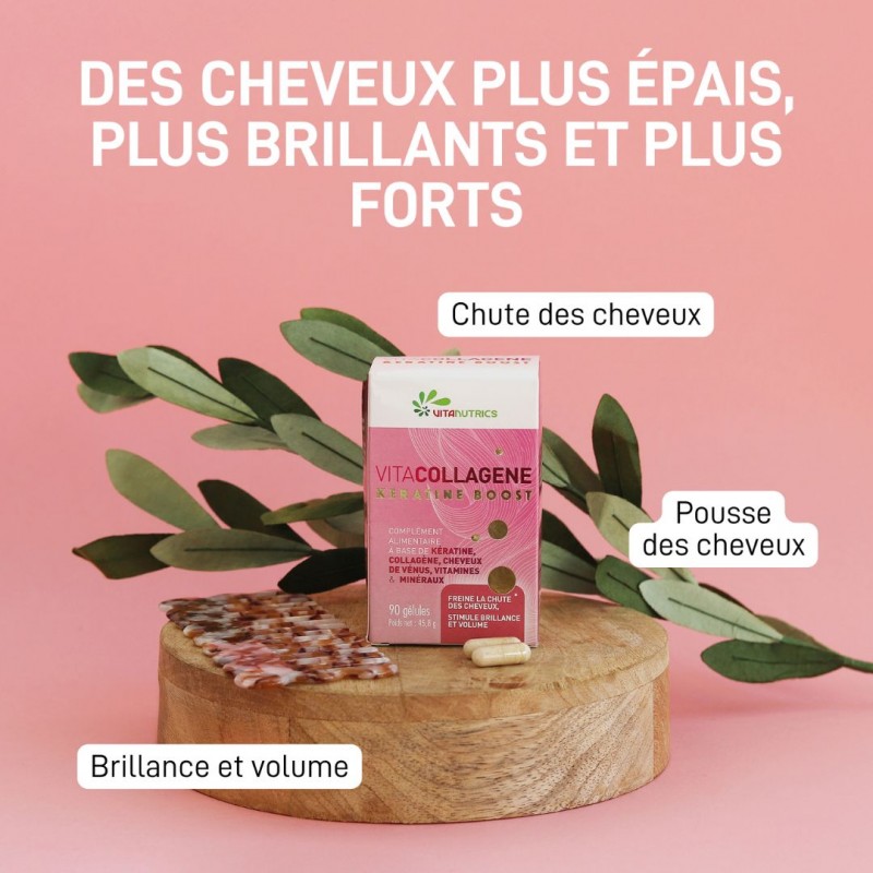 La prise de VITACOLLAGENE KERATINE BOOST permet de prévenir la chute des cheveux (4) et de stimuler la repousse. Vos cheveux sont beaux, brillants et en pleine santé.