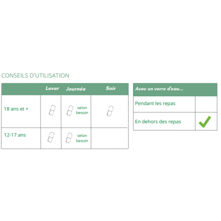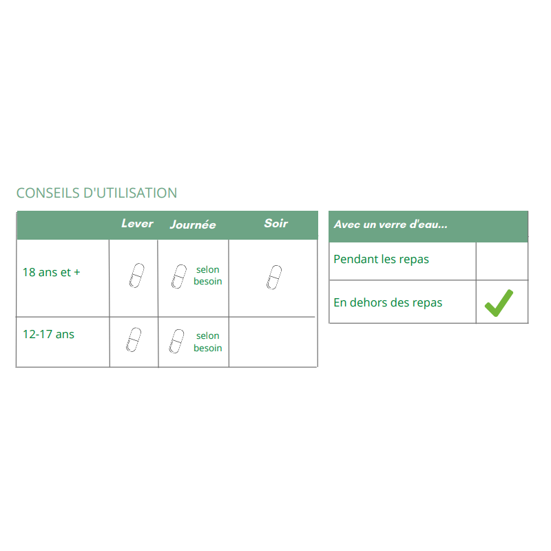 18 ans et plus : 1 gélule le matin, 1 gélule le soir. Vous pouvez reprendre une gélule supplémentaire durant la journée si besoin.